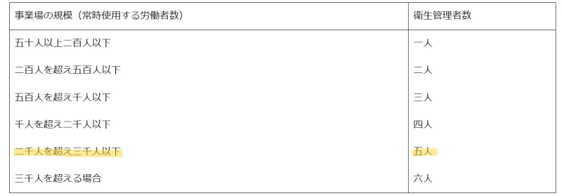 - 常時2,000人を超え3,000人以下の労働者を使用する事業場では、4人以上の衛生管理者を選任しなければならない。